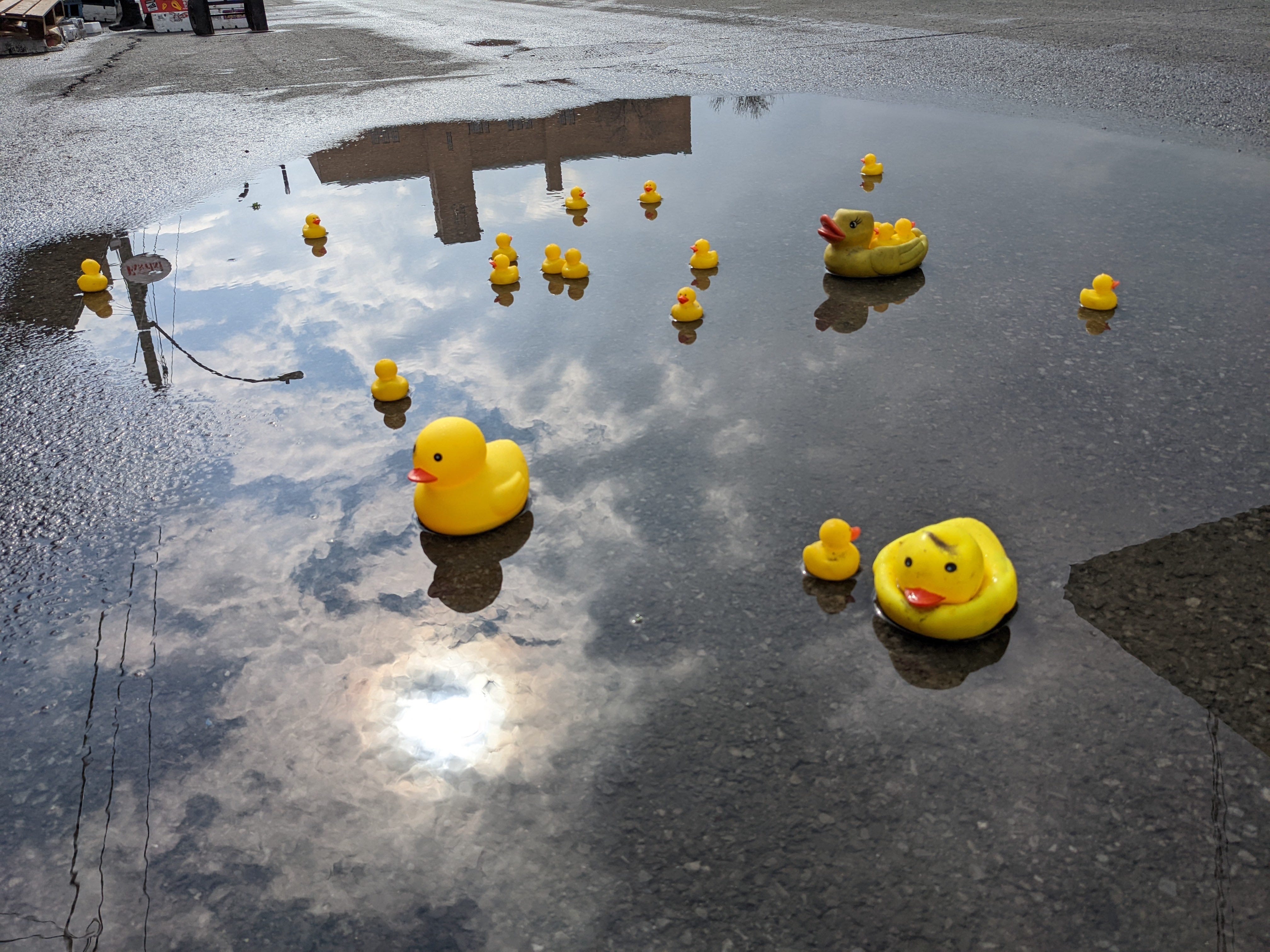 It had rained for three days without stopping. The plastic ducks floated in the puddle as though they had always been there, as though no one had placed them. Their yellow was too bright. Too deliberate. You could not look in their direction without wanting to look away.
