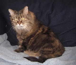 Ma vieille grognonne, en plus de ne rien vouloir savoir de mes deux petites nouvelles, me fait le coup de devenir encore plus handicapée qu'elle ne l'était déjà! Son arthrite semble la faire souffrir énormément, elle ne tient pas en place et ne semble pas savoir ce qu'elle veut... Un saut sur ma chaise, à prendre le trois-quart du siège... au bout de 30 secondes, un saut en bas... et retour sur la chaise pour un autre 30 secondes... elle m'énerve!!! Mais si ça fait mal, ça peut être difficile de rester en place longtemps, comme tout bon vieux chat qui se respecte