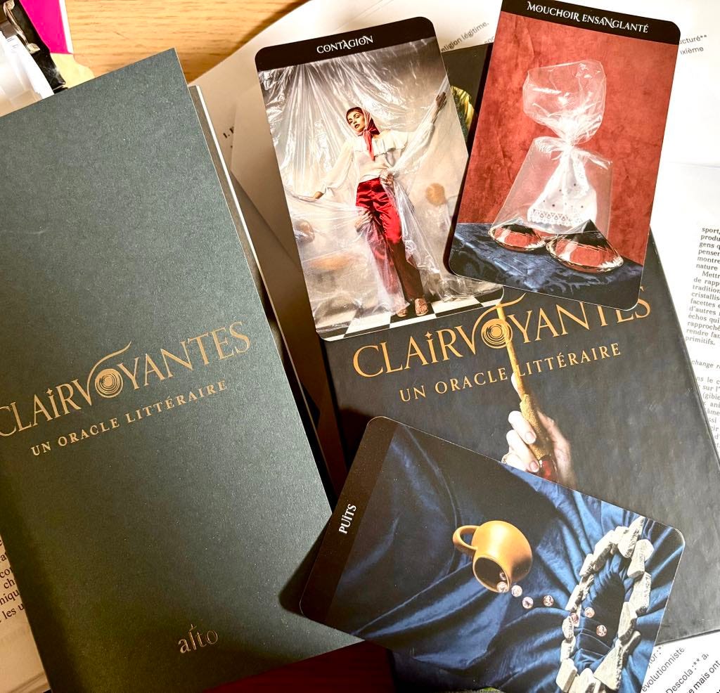 J’aurais aimé ça, t’écrire à propos de mes cartes tirées du jeu de tarot des Clairvoyantes. Une belle main composée de la Contagion, du Puit et d’un Mouchoir ensanglanté, superbe thématique ouvrant la porte à une énigme bien mystérieuse, un soupçon de frisson et une descente au plus profond de soi, là où l’air manque et où le sang s’affole. Je me sers de ce genre de support quand l’inspiration manque ou que je peine à poursuivre un fil qui pourtant présentait de belles possibilités.