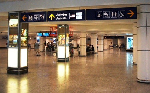 Anyway, le taxi finit par me laisser descendre à quelques pas de la porte des arrivées internationales, il est 16 hres. J'entre... Oh MY GOD!! C'est qu'ici aussi, y a du monde!!! Après consultation du tableau des vols, je vois avec bonheur que le London/Heathrow est prévu avec quelques minutes d'avance. Je me présente devant un gros monsieur, bien calé dans son siège sous une affichette annonçant 'Informations' et lui demande si je suis bien au bon endroit pour les arrivées. Il me dit que oui, me demande quel vol, quelle heure et m'assure que mon homme ne passera pas cette barrière avant une bonne heure après celle prévue pour l'atterrissage.