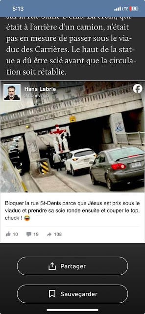 Sur mon cellulaire auquel ne reste que 20% de vie renouvelable, je lis qu’ailleurs, rue Saint-Denis, Montreal, Québec catholaïc, Jésus sur la croix bloque la circulation, sa grandeur ne pouvant plier les genoux pour passer sous un viaduc!