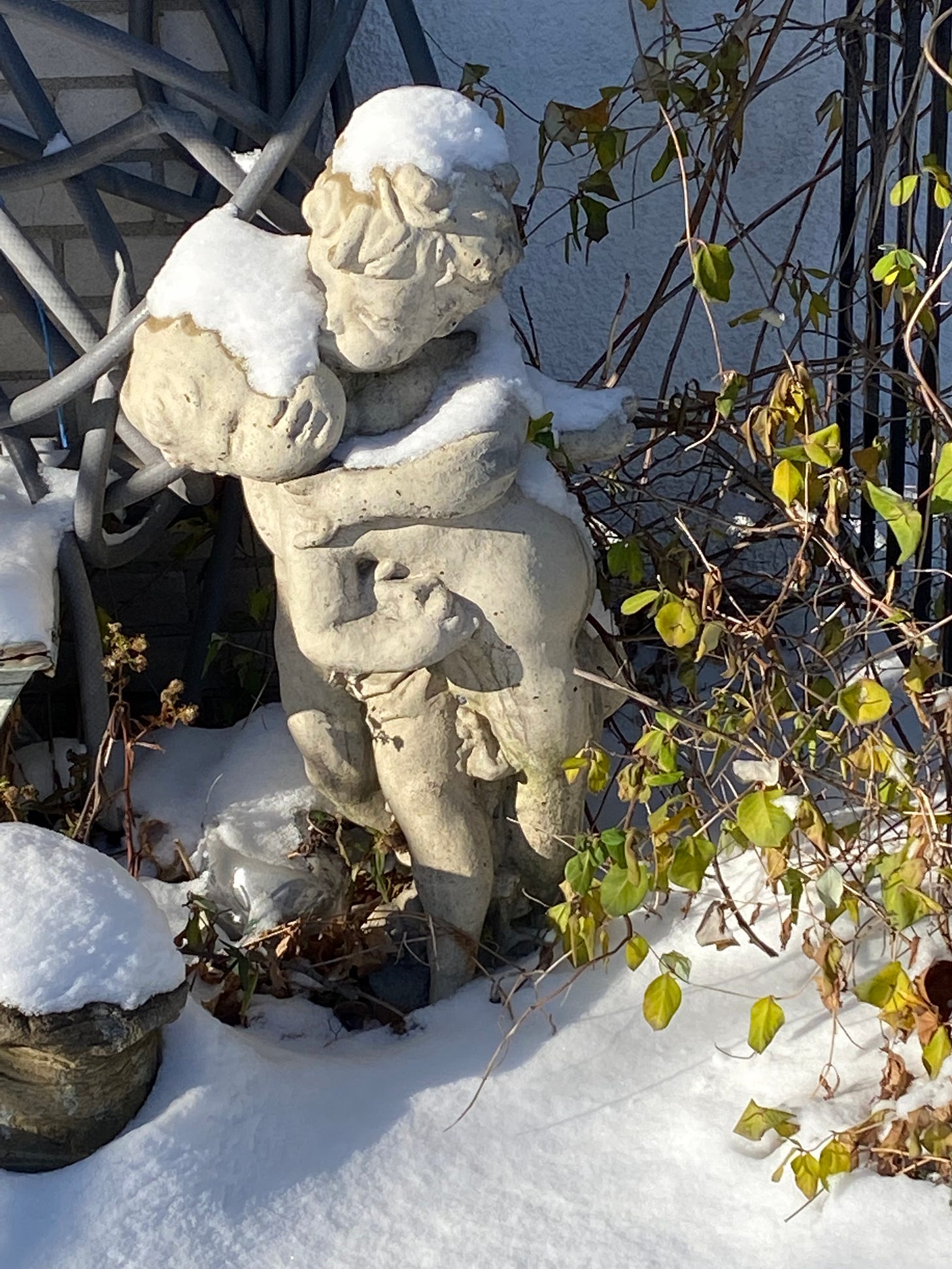 Deux enfants figés sur le seuil d’un rêve. Le plus grand serre le plus petit contre son flanc, un bras autour du torse, l’autre enfoui comme une racine sous l’aisselle. Le plus jeune, lui, penche vers l’avant. Cherche-t-il à fuir cette étreinte trop insistante ou simplement à poursuivre un mouvement que l’hiver a retenu? La bouche du petit, ouverte à peine, suspendue entre un cri et un rire inaudible. Dans le silence de la pierre, un battement se devine, ténu, obstiné, le pouls de quelque chose qui vit là, sous le froid.