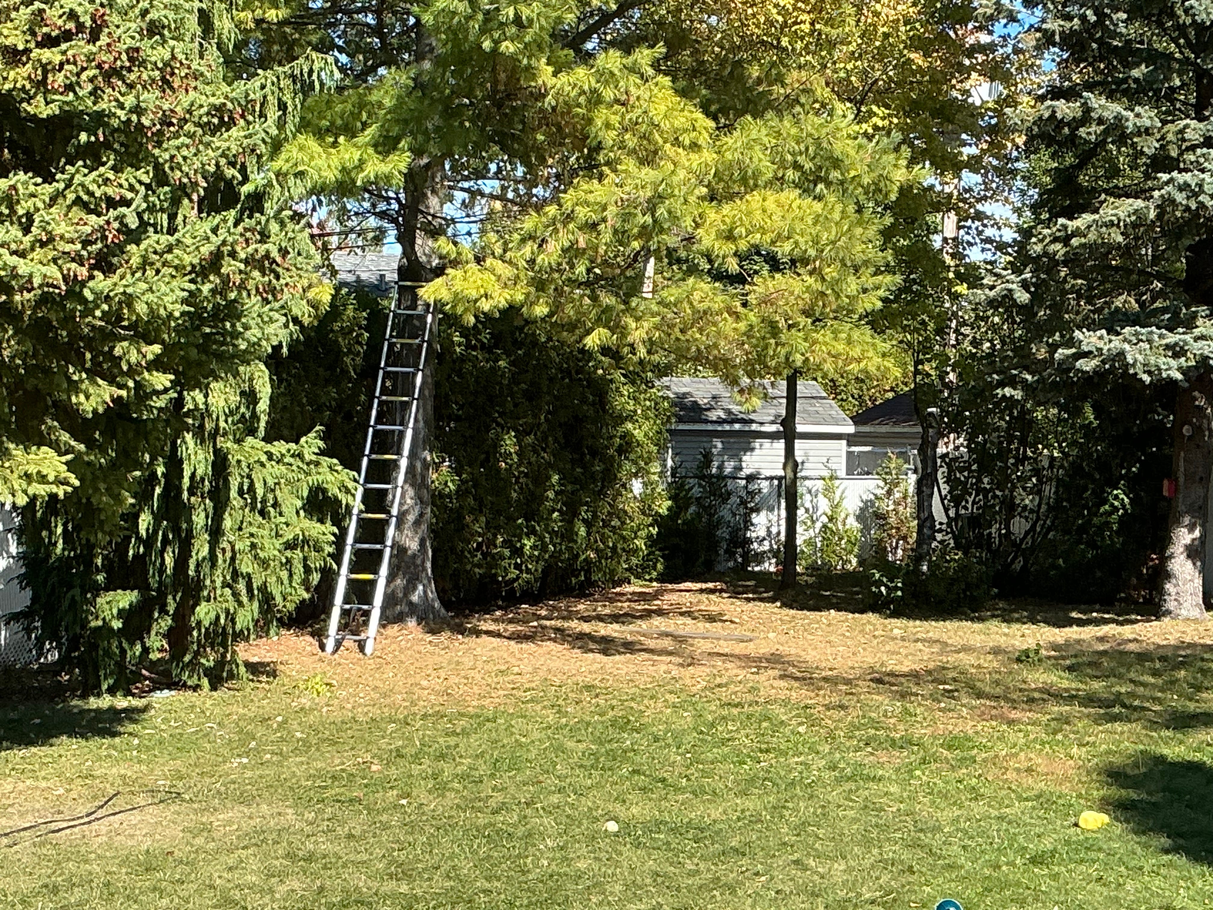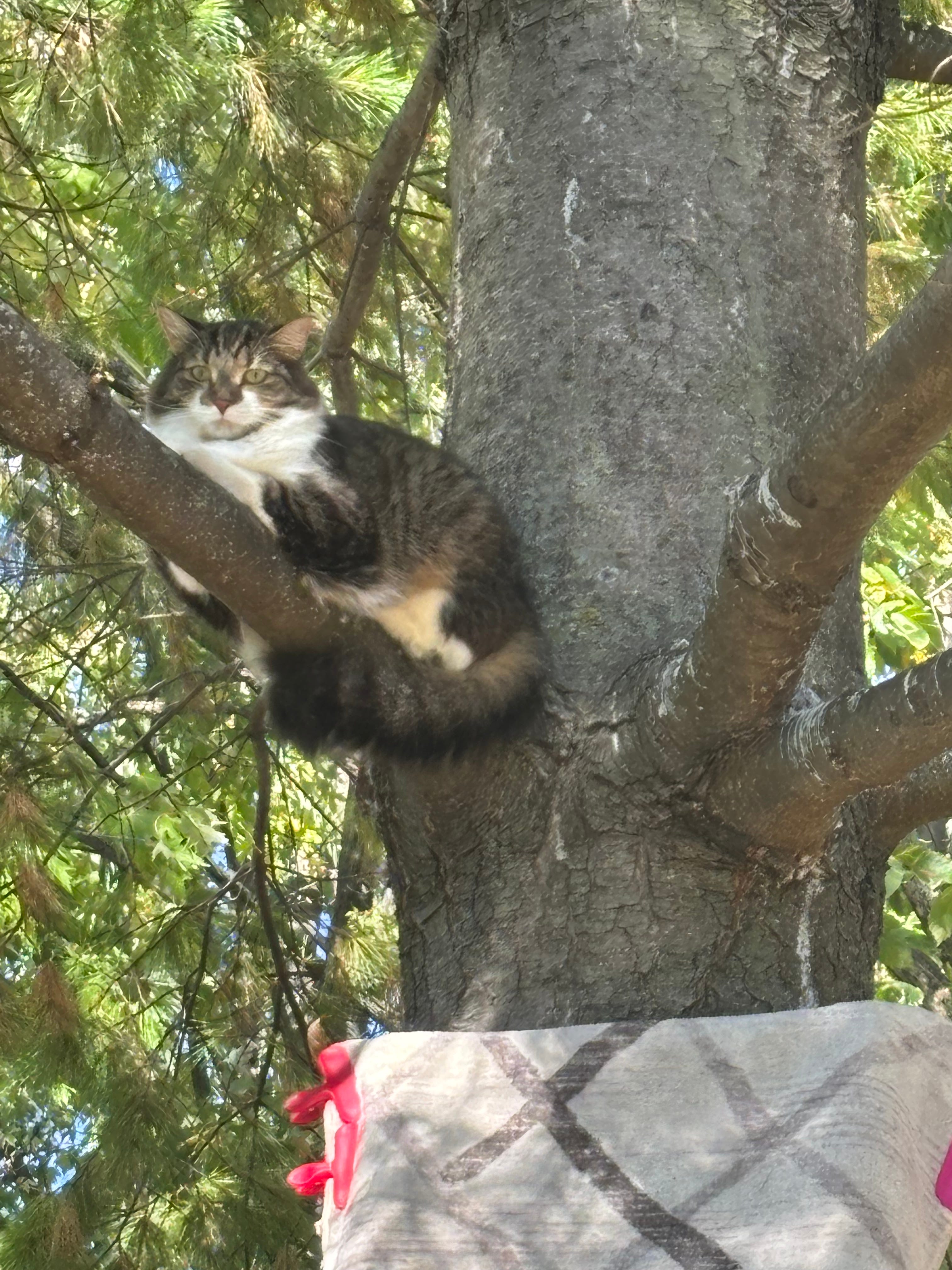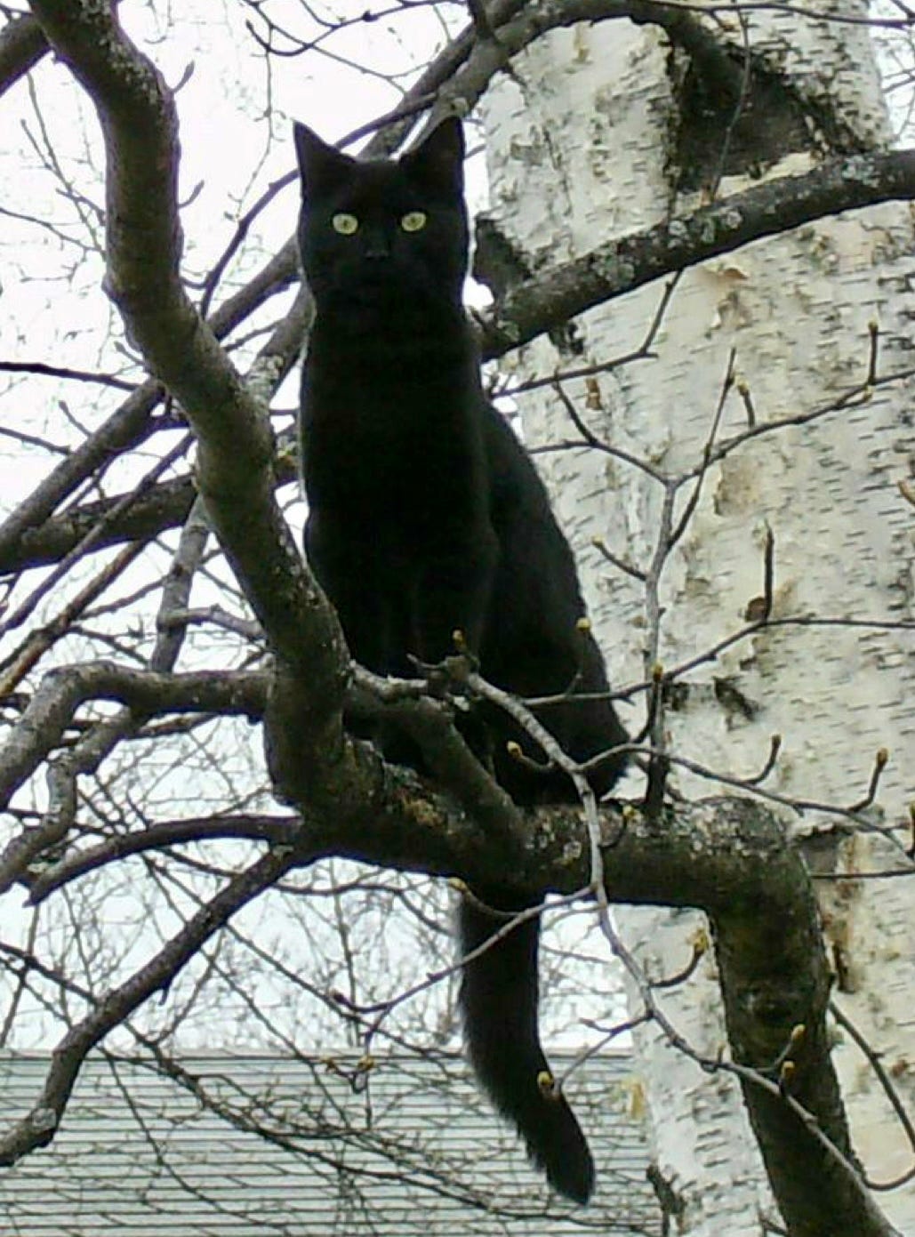 Ce texte fut créé vendredi dernier, alors qu’un chat, pas noir, a trouvé refuge dans le pin géant de ma cour. Je le comprends, le pauvre! Victime d’une poursuite sauvage par Sherlock, il a pris le plus court chemin vers une sécurité toute relative. Il ne savait pas descendre… De midi jusqu’à tard dans la nuit, il y est resté, malgré nos efforts pour lui rendre la sortie plus facile, plus digne. Nous, bin énervés, lui, pas stressé, l’air super zen… Le lendemain matin, à mon grand soulagement, il était parti…