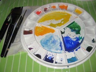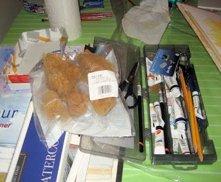 Bon, je pense que pour l'équipement, c'est à peu près ça... Il y a aussi tous les petits trucs qu'on trouve déjà à la maison, comme des éponges naturelles, des vieilles cartes de crédit, des pots de yogourt vides et des pots Masson qui seront mis à contribution à un moment ou un autre en cours de route. C'est fou, des fois, je me dis que ça ressemble plus à du bricolage qu'à de la peinture. Donc, équipée je suis, au boulot je vais!