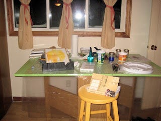 J'ai installé tout mon fatras sur la super table de coupe qui n'a jamais servi à couper quoique ce soit. Pratique, à bonne hauteur pour travailler debout, et grande en masse une fois toute dépliée! Je l'aime mon petit coin peinture devant la fenêtre!