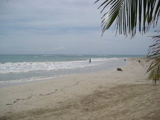 Je respecte beaucoup la mer et me baigne rarement, c'est trop fort, trop vaste, mais l'absence de 'commodités' me forcent à m'y rendre. Ça deviendra la blague de la semaine: Jo ne va à la mer que pour y faire pipi! Ben oui... Et comme je ne vois personne s'accroupir sous un palmier, je crains bien que je ne sois pas la seule à démontrer mon respect pour l'océan de cette manière impie. Ça va, vous ne me la ferez pas, je sais que vous tous le faites aussi!!