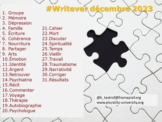 Pour le rappel, revoici les thèmes abordés en ce mois de décembre qui commence en lion dans mon patelin glaçé... -15C ce matin encore, il est tôt en saison pour de tels chiffres dignes d'un congélateur!